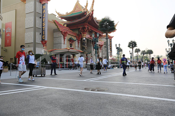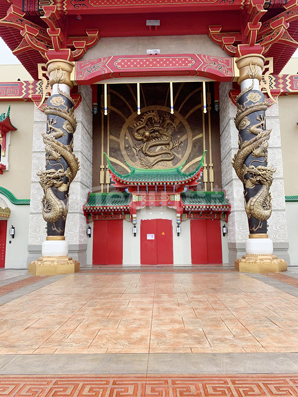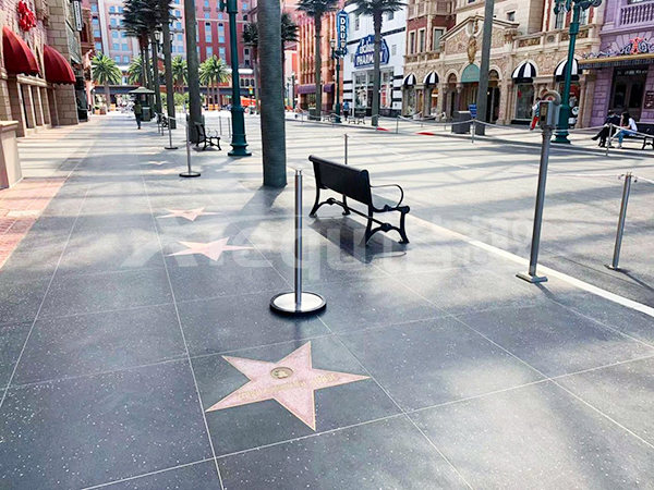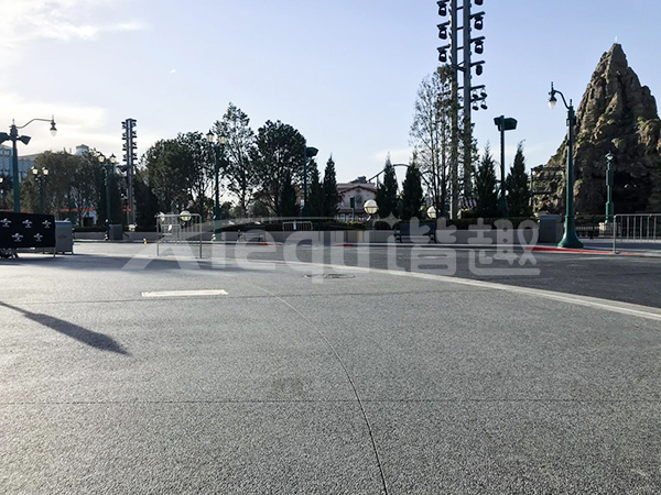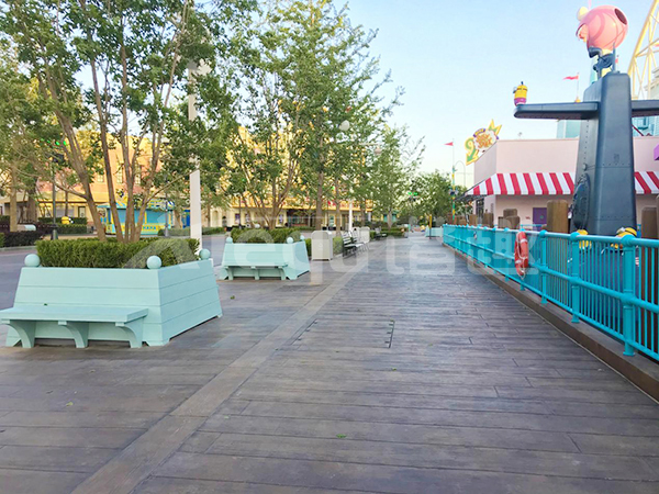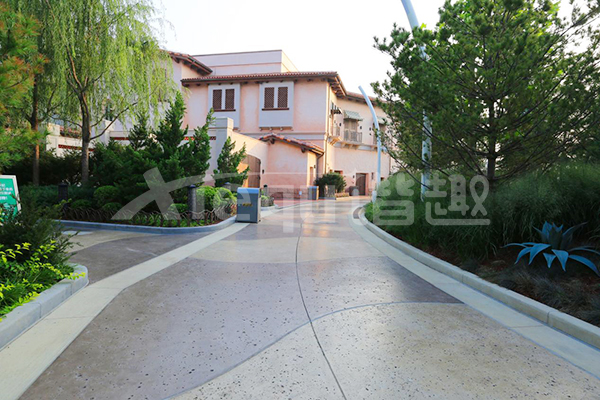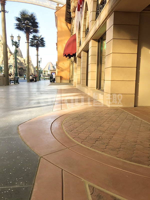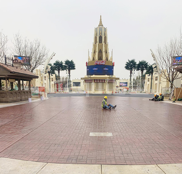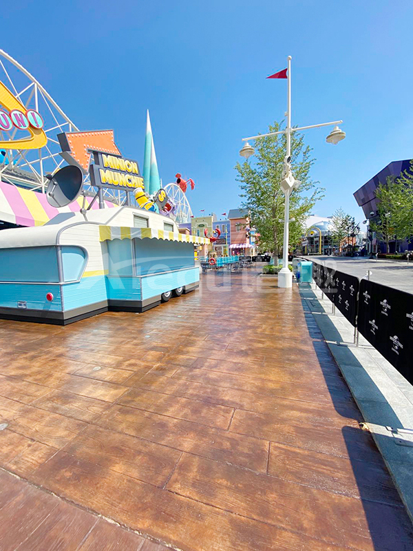 我司參與了北京環(huán)球影城好萊塢大道和小黃人兩個(gè)主題的路面鋪裝工作,鋪裝面積為2.4萬㎡。其中包含了彩色混凝土礫石面藝術(shù)地坪、彩色混凝土壓印藝術(shù)地坪、彩色混凝土洗砂面藝術(shù)地坪、彩色混凝土鹽巖面藝術(shù)地坪、彩色混凝土仿泥仿塵藝術(shù)地坪、整體現(xiàn)澆路牙、掃毛面、座椅墻、化學(xué)著色等鋪裝硬景。